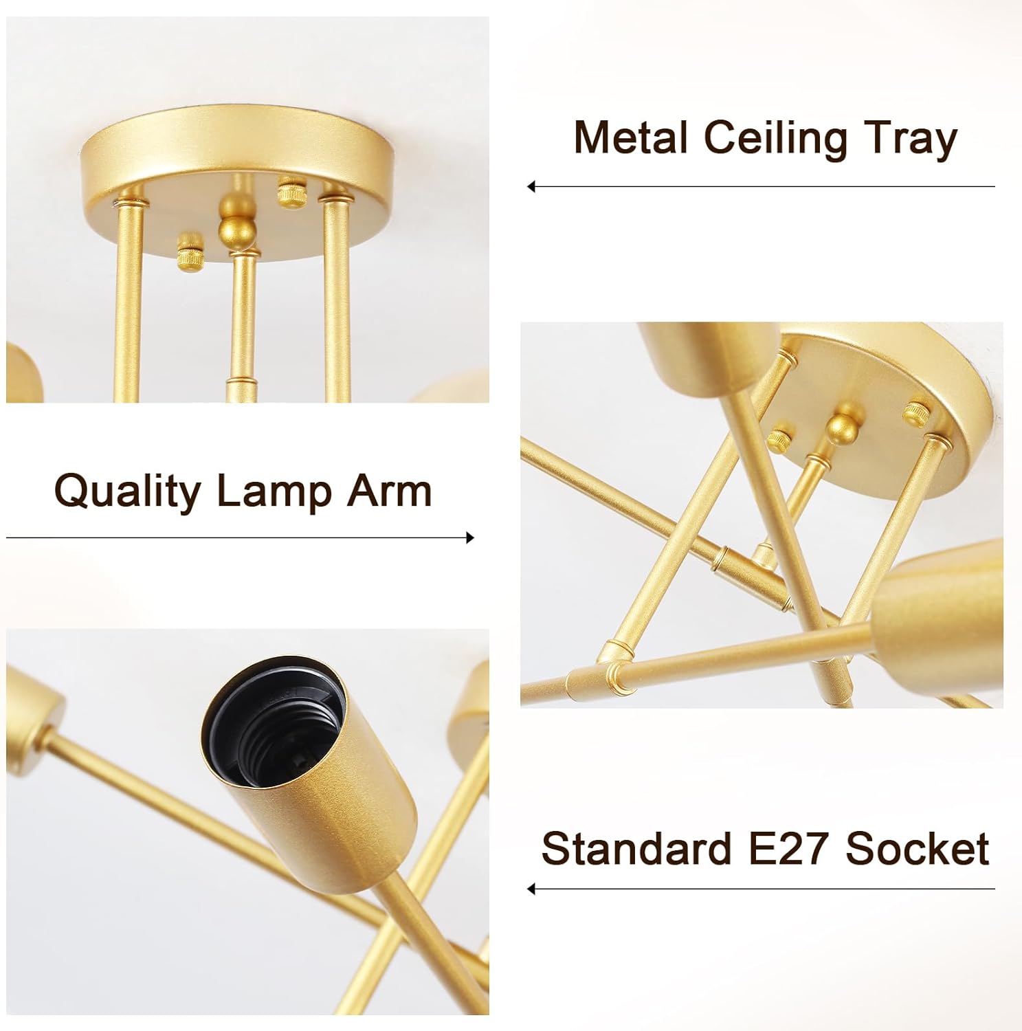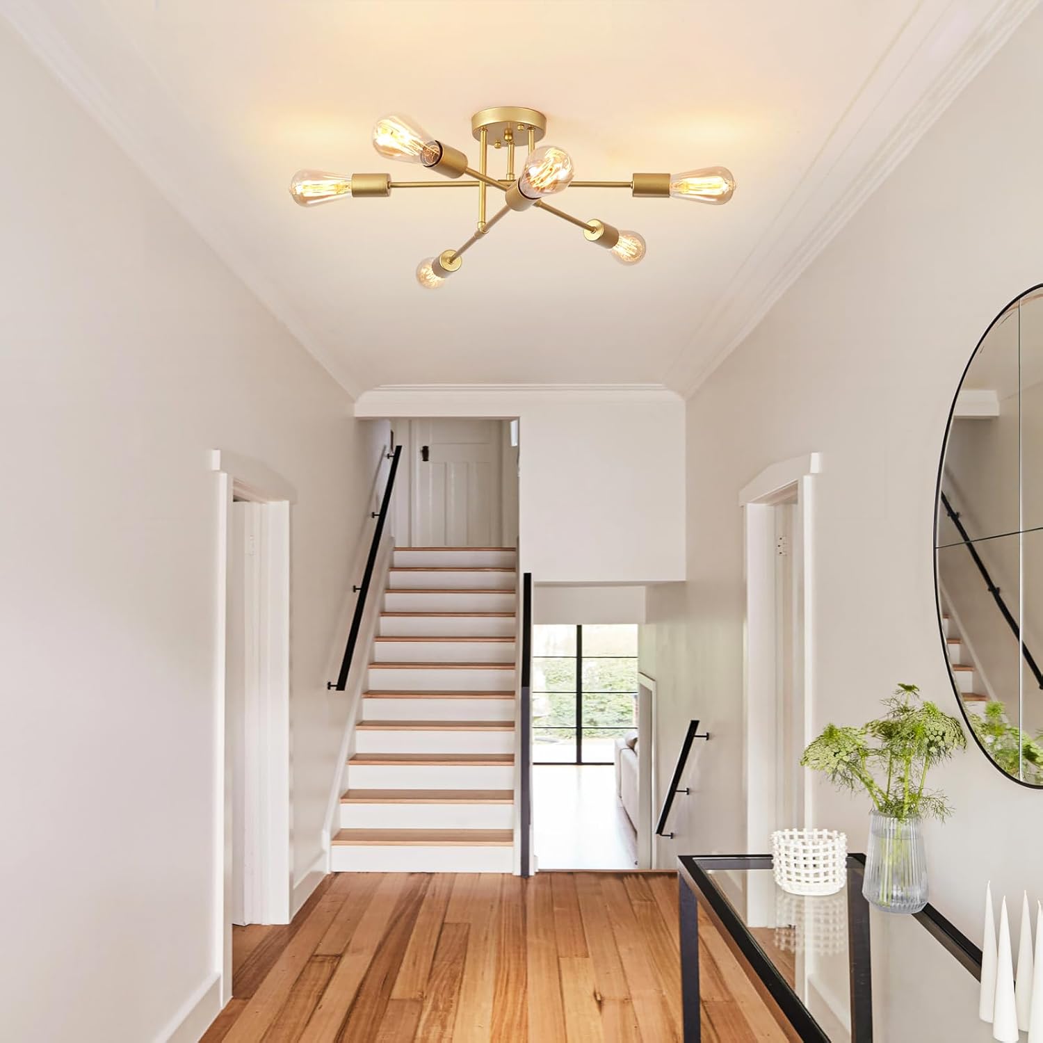 • 【Multi-Room Adaptability】From kitchens and corridors to living rooms and bedrooms, this gold sputnik ceiling lighting adapts effortlessly. Its versatile semi-flush design suits low ceilings while adding a touch of luxury to offices, entryways, or compact spaces.